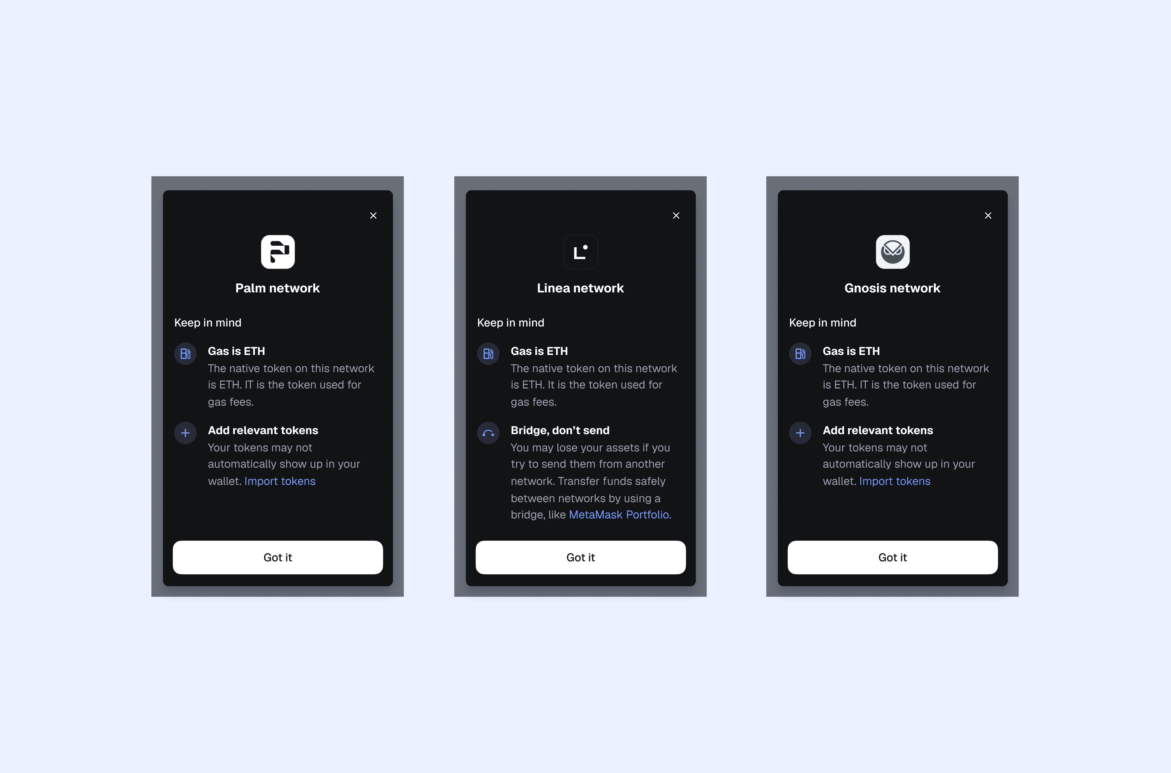 Introduced educational modals that were displayed when a user first switched to a new network to provide information in context.